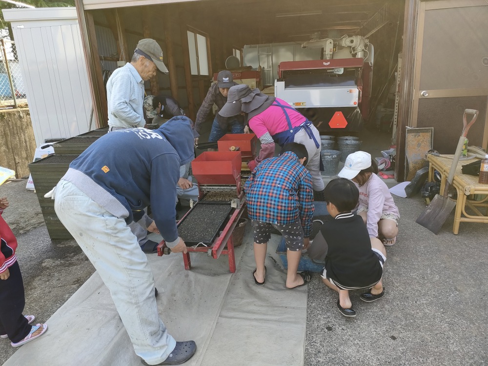 浸種(しんしゅ)した種籾を育苗箱にまく工程です。