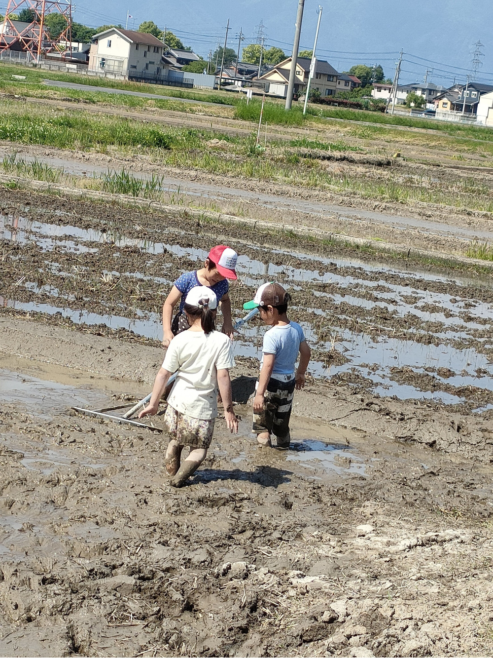畝(うね)の隣では子供たちが泥んこで遊んでいます。。