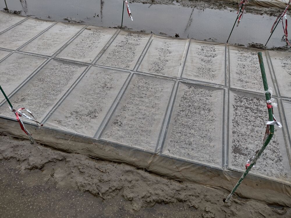育苗箱を並べ、保護シートを被せます。保温のためです。