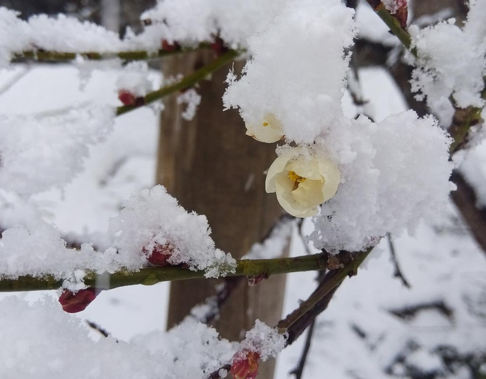 寒さに強いのか、雪が積もると、梅の枝は活き活きと力強くなる。