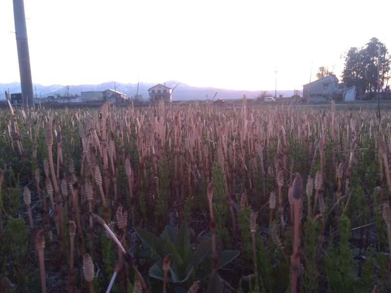 【写真】は、夕方の作業場横のつくし野原