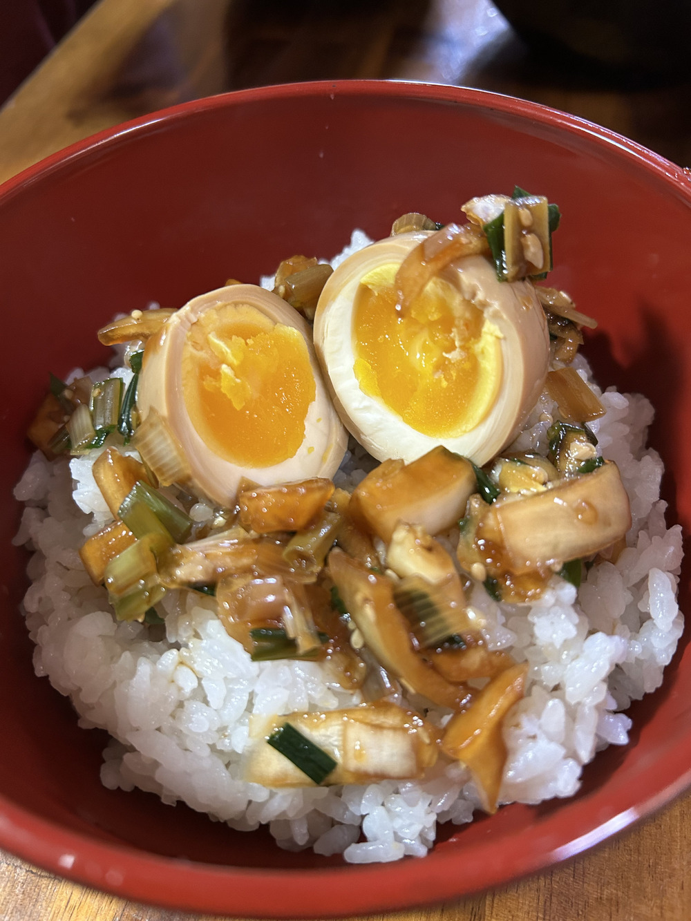 麻薬卵をのっけたご飯🍚に納豆を加え、混ぜて口の中に、、