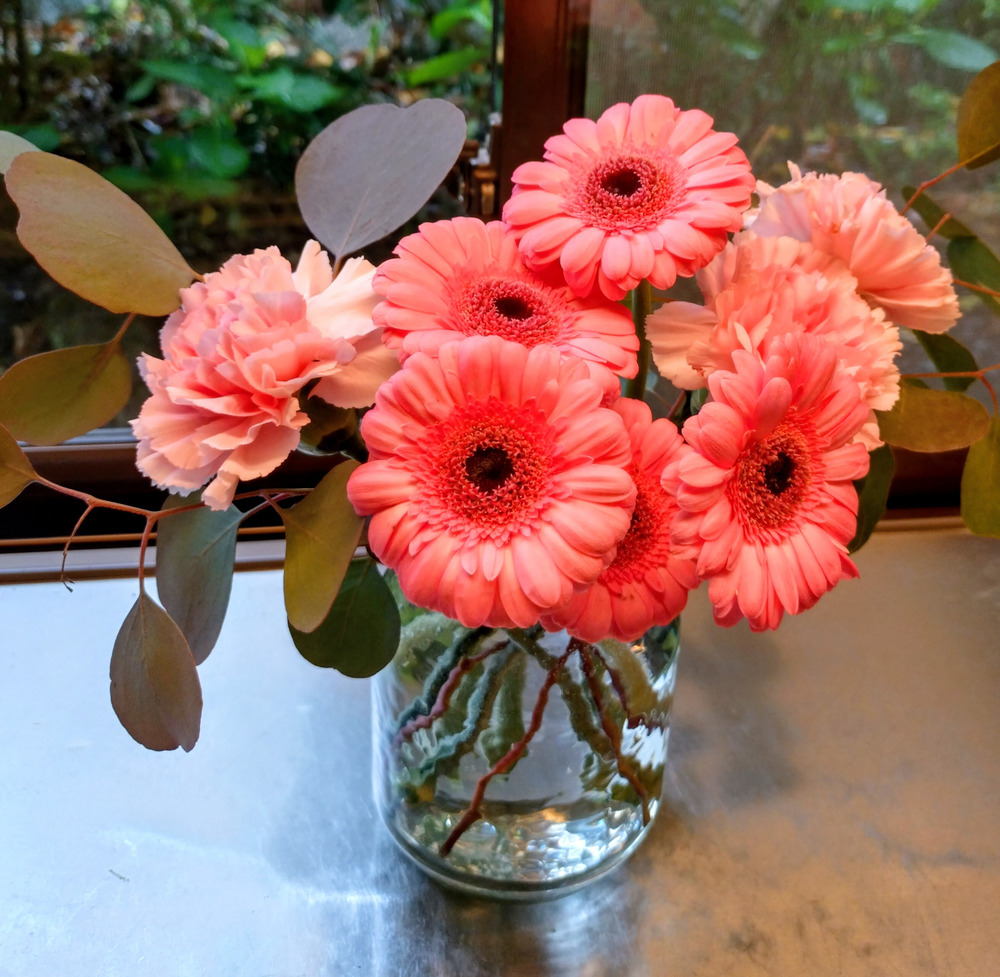 ガーベラと一緒に飾ってる、緑はユーカリ!