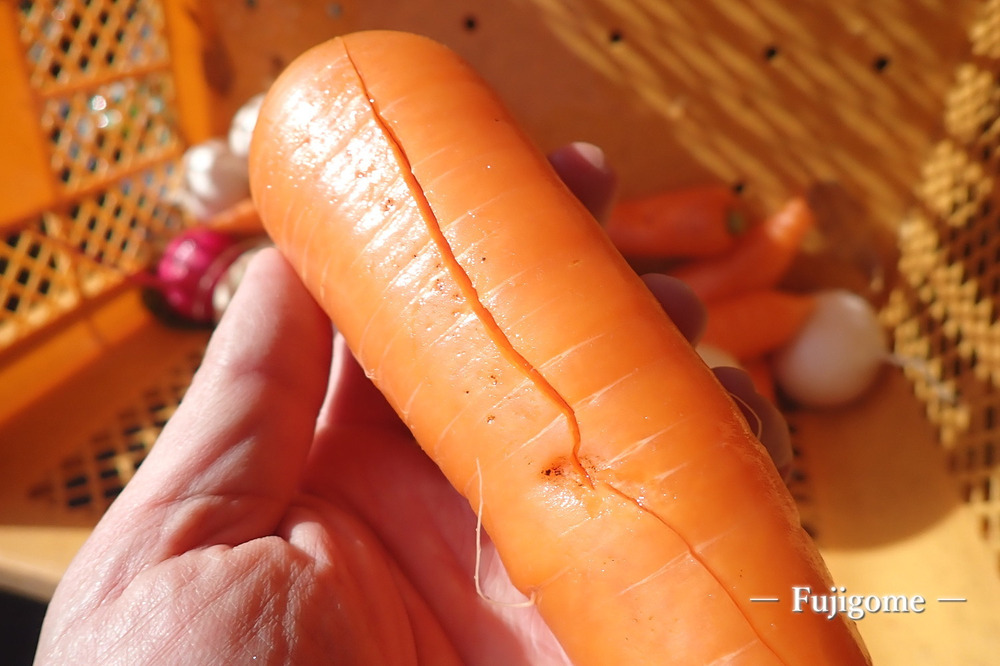 「うっ!さぶ!」と思って身を縮めるのかも。「フッ」と息を吹きかけたぐらいの小さな衝撃でも「ピシッ」と音を立てて割れます。その音が心地よいわけですが、割れてほしくはない。なので、そーーっと抜いて、そーーーっと置きます。ニンジン同士がちょっとコツンでなると「ピシッ」……(泣) そんなニンジンがオマケで入ることがありますがご容赦を