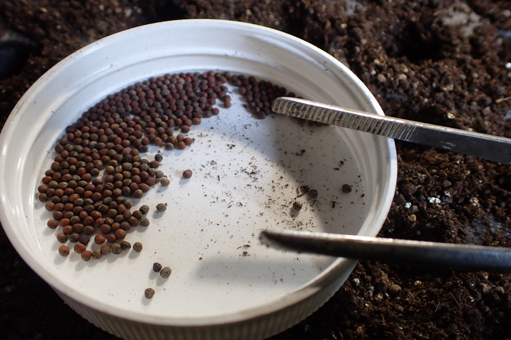 以前はガチャッてやると種がパッと落ちて簡単に種まきできるシーダーを使ってましたが、最近は栽培の都合上ピンセットで1粒1粒根性で播いてます。