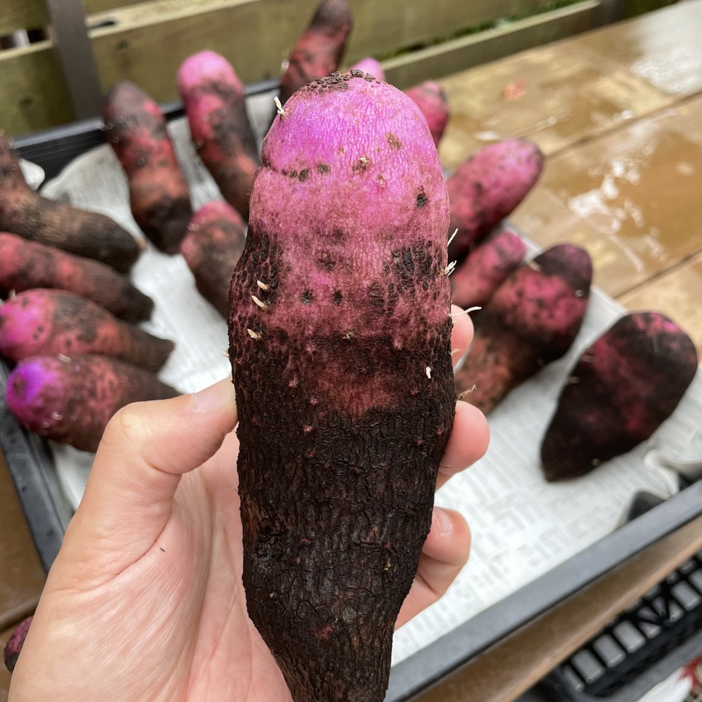 色は鮮やかですが味にクセはなく、すりおろせば非常に粘りが強くお餅のような食感に。火を通せばホクホクむっちりと色々な食べ方でお楽しみいただけると思います。