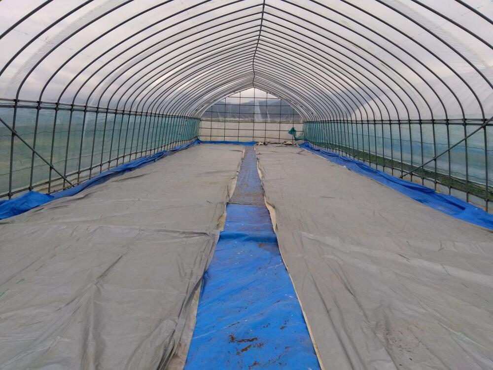 運んだ苗はまだ太陽の日差しに弱く寒さにも弱いのでシートを被せて大事に育てます。