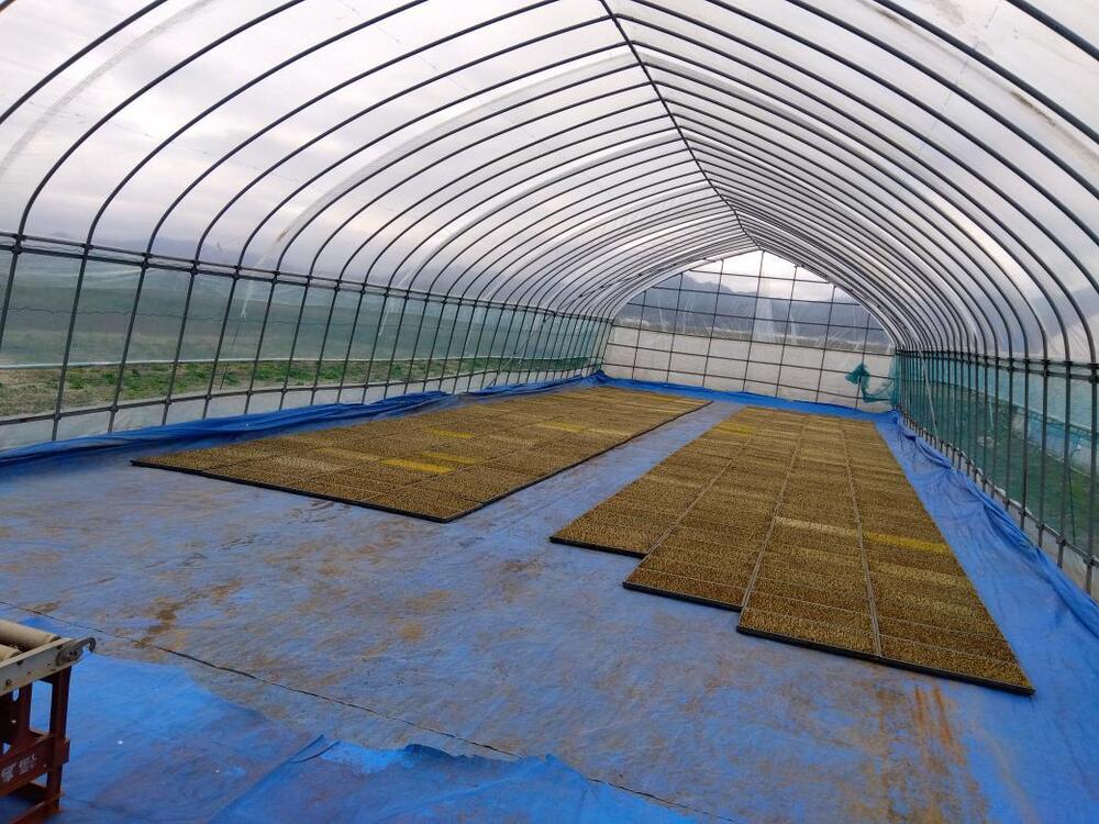 月曜日に種まきをした苗箱からは芽が生え始め育苗器からはビニールハウスへ苗箱を移動させました。