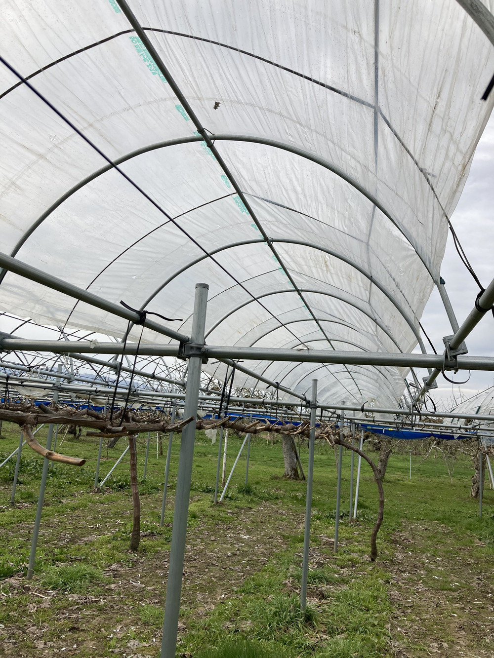 今日から、雨よけビニール被覆作業始めました。病気予防と、農薬削減にかなりなるのです。完全露地だと、年間消毒回数が12から14回位ですが、雨よけビニール被覆すれば、5から7回に減らせます。 自分達は、さくらんぼやりんごもあるんで、ぶどうの農薬散布回数減らせるのはめっちゃありがたい話です‼️ びっくりするくらい病気予防になります😄このビニールも今年で3年目笑 全然余裕で綺麗です😄
