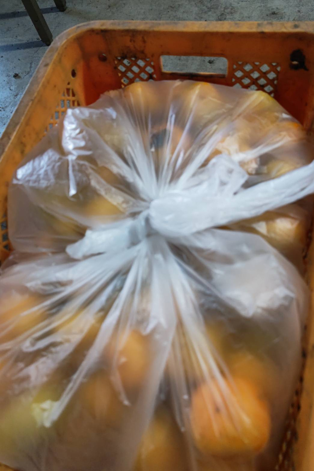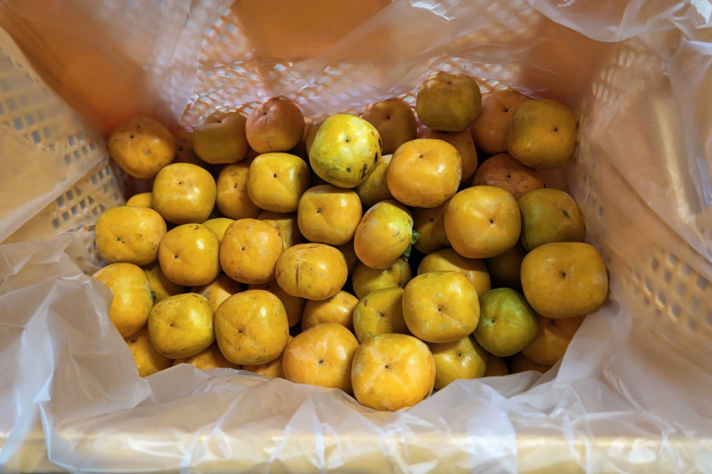 渋抜き用の焼酎と渋柿をビニールに入れて密閉しました😃約2週間くらいつけると渋が抜けて、甘く生食でも食べられるようになります!!