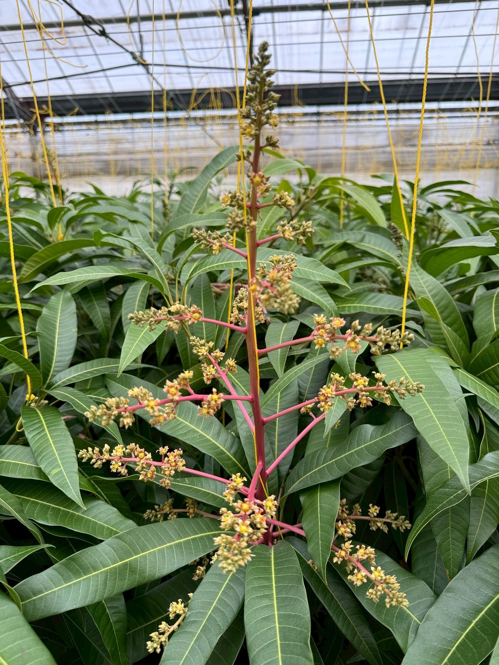 数百の花がつく様です。マンゴーの花は、りんごなどと同じ両性花になり、おしべとめしべが同じ花についているんです。