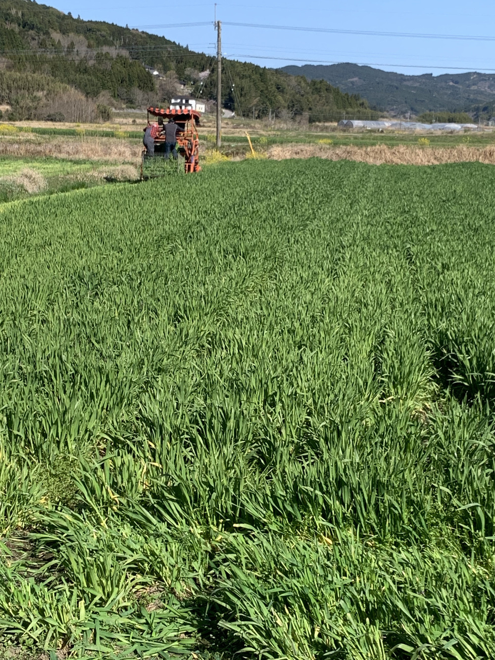 コンバインみたいな機械の後ろにカゴがあるので、その中に二人で入って、流れてきた大麦若葉を必死にふみふみします。もーこれが大変⤵︎ 汗がとまりません。