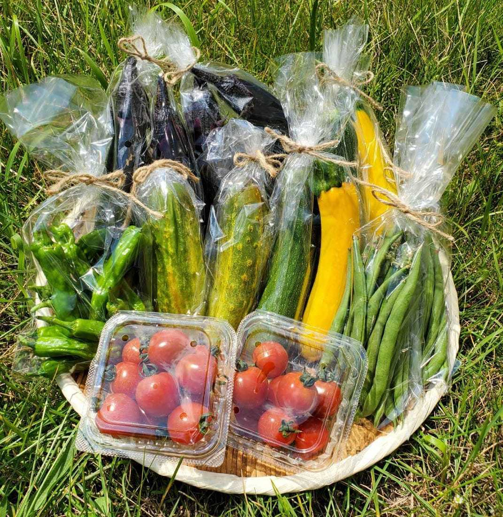 ミニトマト、ナス、糠塚きゅうり、ズッキーニ、インゲン、バジル、レモンバーム、ペパーミント、シシトウ、エディブルフラワー(食べるお花)の中からその日収穫できたものを80サイズに入る分たっぷり詰めてお届けします♪