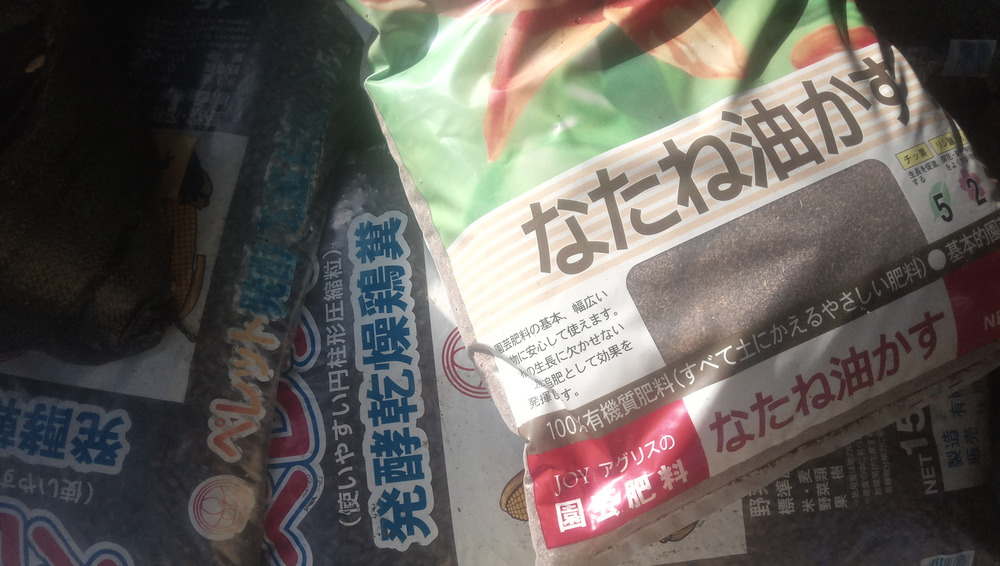 【使用資材】苦土石灰、ようりん、油カス、発酵鶏糞、籾殻勲炭、草木灰、米糠ボカシ、汚泥堆肥。