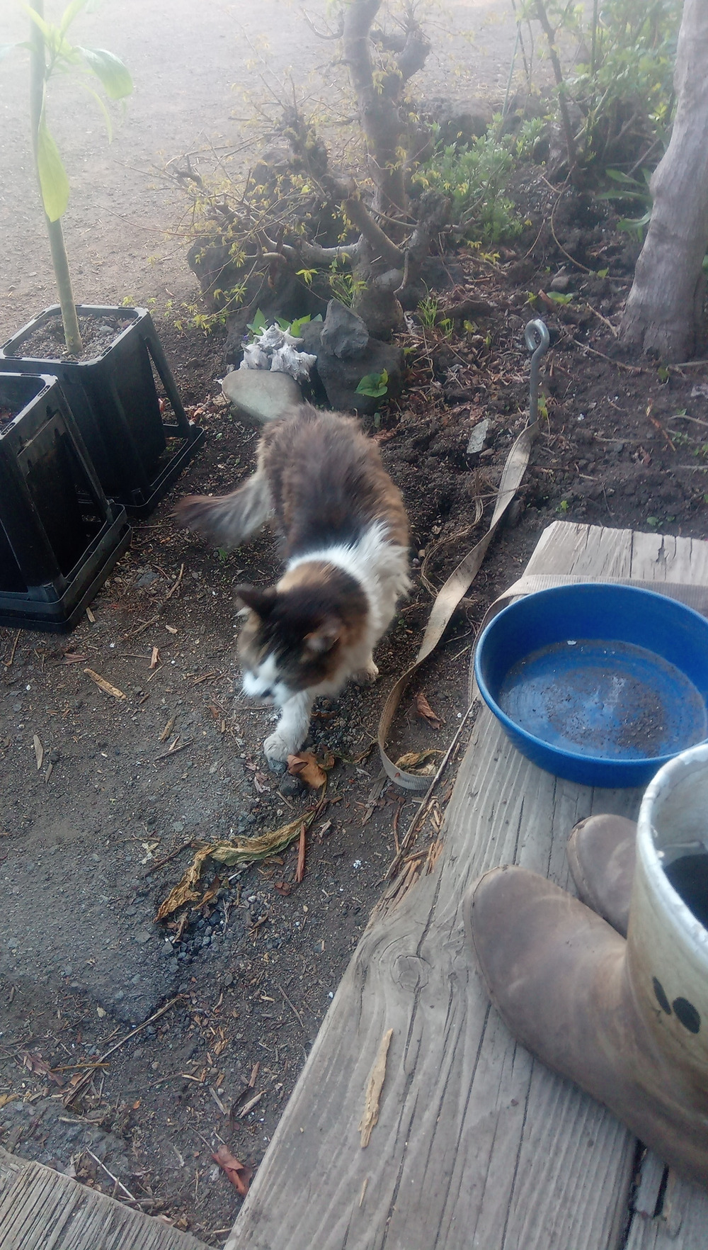 名前はタマです。あまり目が見えていない猫で、時間ある時に外に出して散歩してもらってます。よたよた歩いて風が吹くと、ふらふら〜っとしちゃうのが、かわいいです!