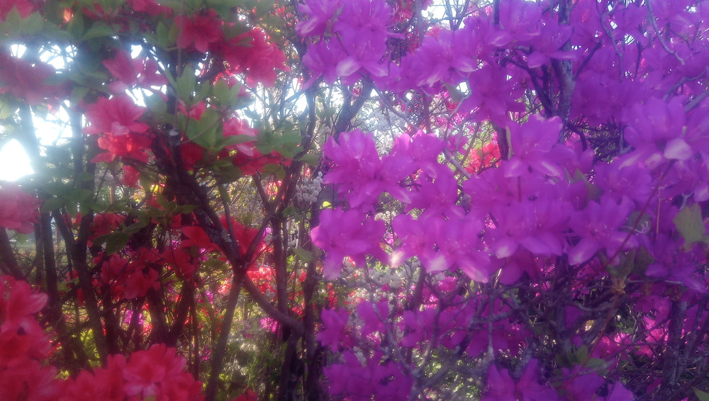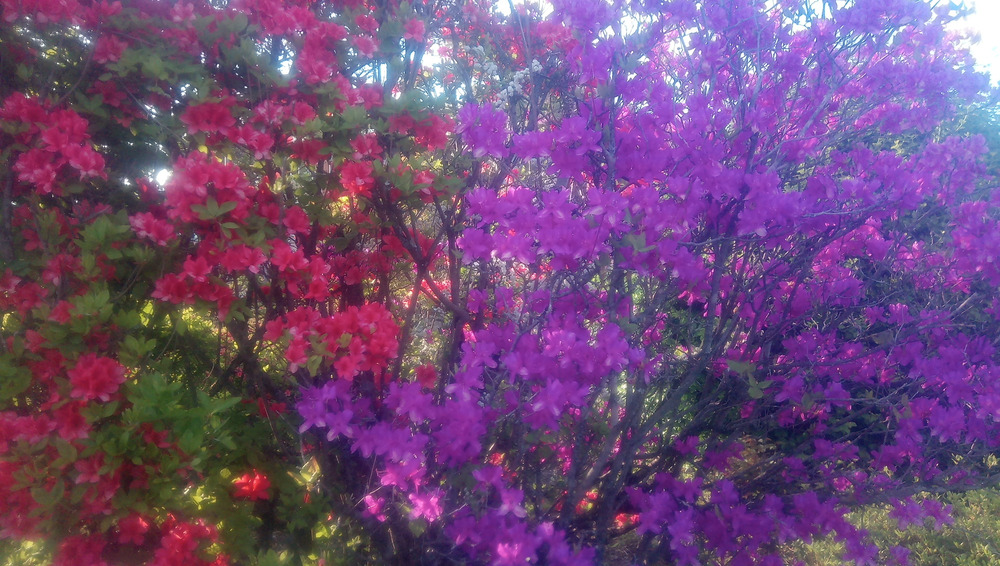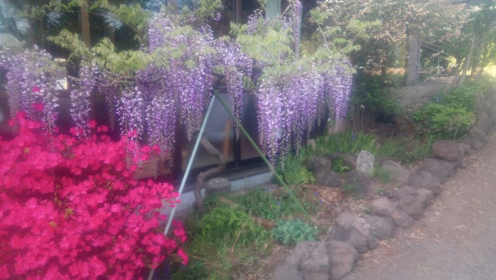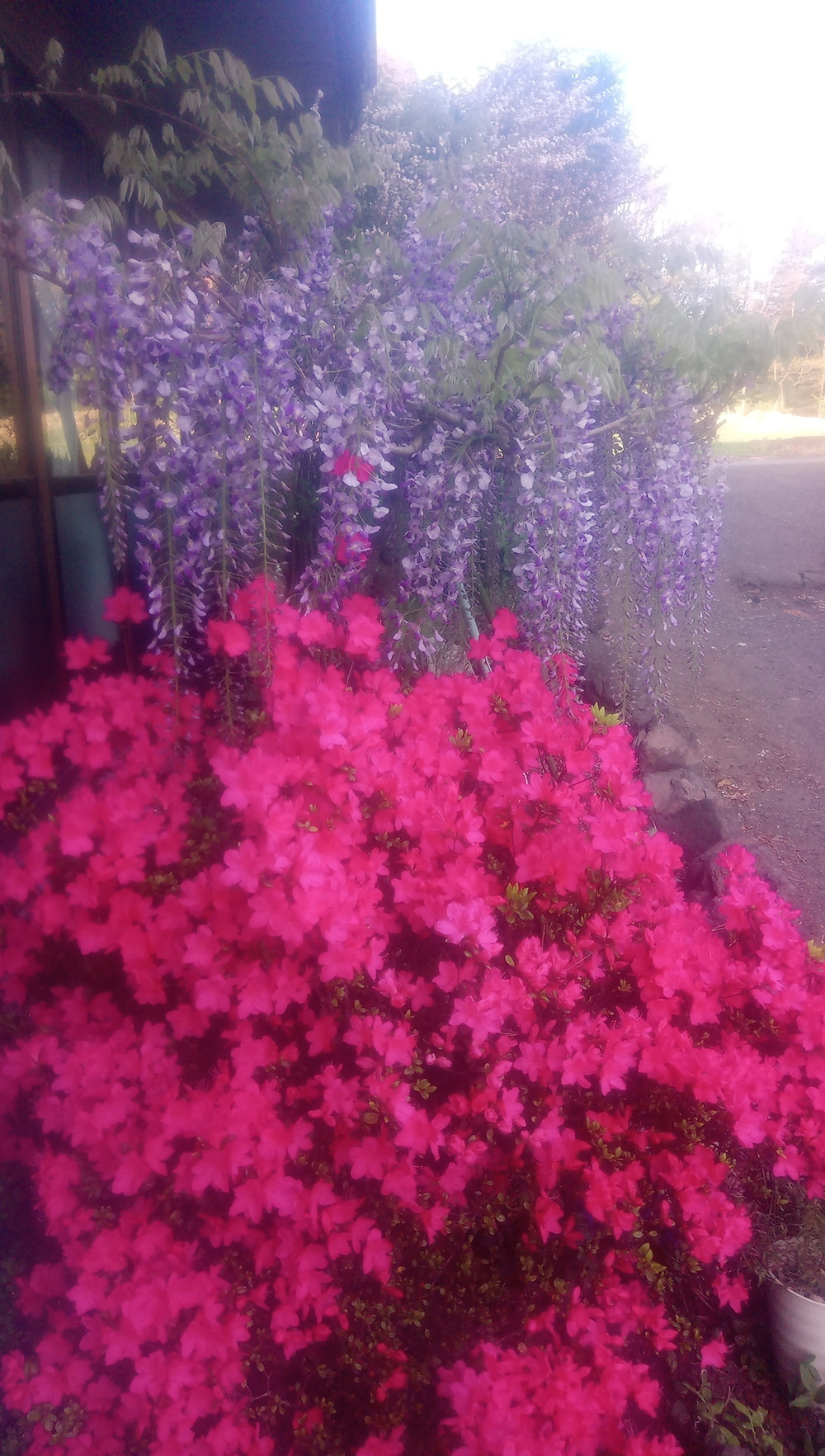 長野原町の町花として、紫ツツジが制定されてるんですよー😊我が家にもあります、写真は赤ツツジ、紫ツツジ、藤の花、あとタマを根本に埋葬したカリンの木の花も咲き始めました(ΦωΦ)👍キツネさん避けでネットや赤外線で探知してビカビカひかる獣避けがセットしてあるのでごちゃごちゃしてます^^;