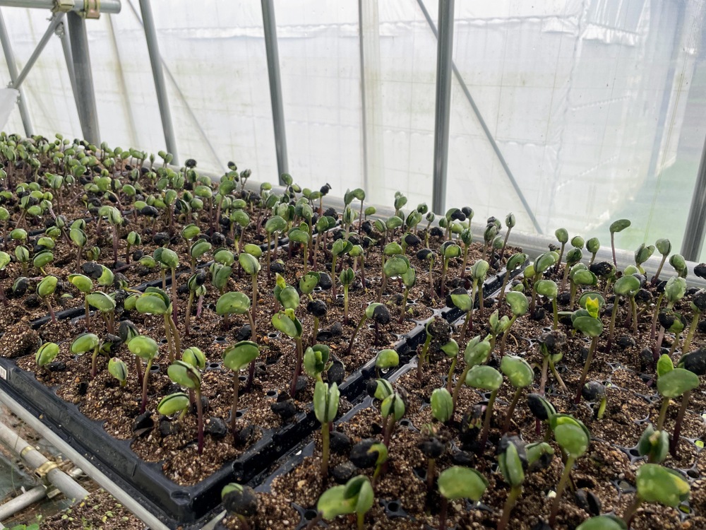 一粒一粒トレイの中に播種し、発芽を待ちます。