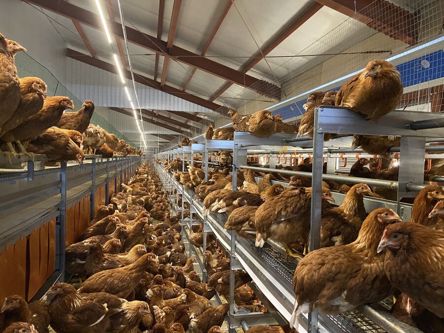 暗くなると巣箱や止まり木で休息できる多段式鶏舎で