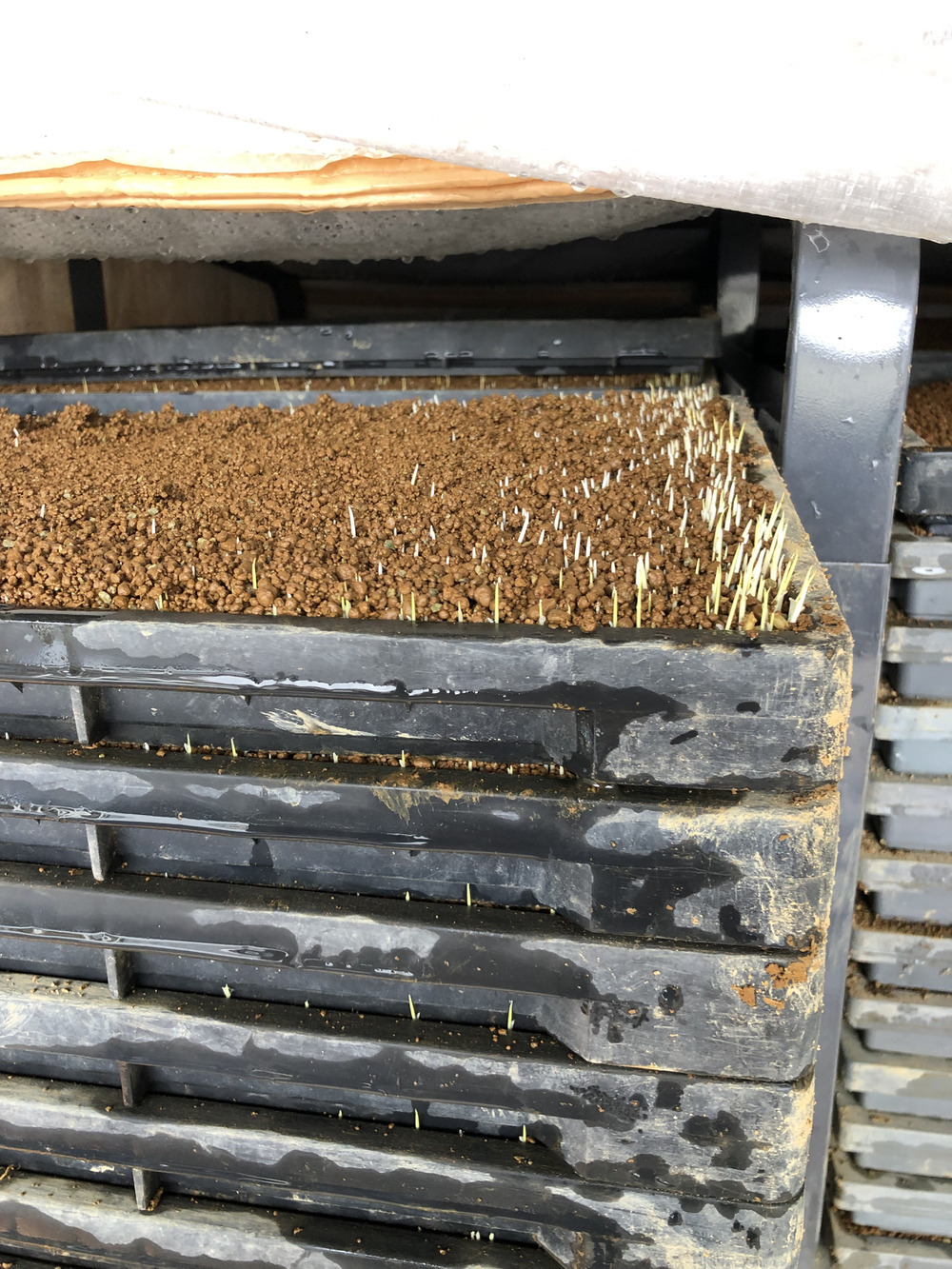 お米の種子を撒いて 育苗キに30度で3日 今日ハウスに並べる作業中
