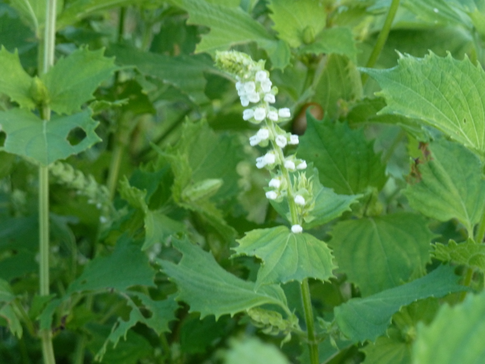 ニラの白い花も咲き、青紫蘇(大葉)の穂先にも花が咲きました。穂紫蘇も出荷を開始します。