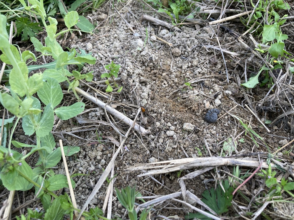 また、草の下に大きな根切り虫(幼虫?)を沢山発見。ウスイエンドウの苗の根元を食いちぎる害虫だが、今のところ大きな被害はなさそうです。