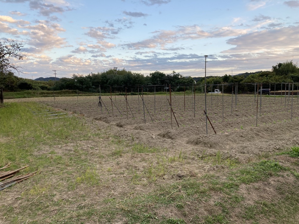 今日は立冬、天気は良いが少し肌寒い一日。今日も昨日同様、白菜の定植、ウスイの支柱とネット張りの準備をしました。