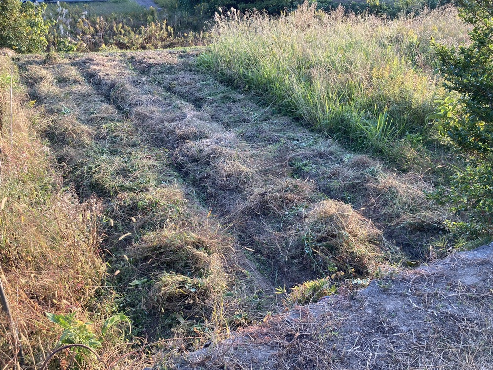 明日は雨になりそうということで、せっせと作業しました。自然農の畝の草刈り、ウスイエンドウのネット張り。
