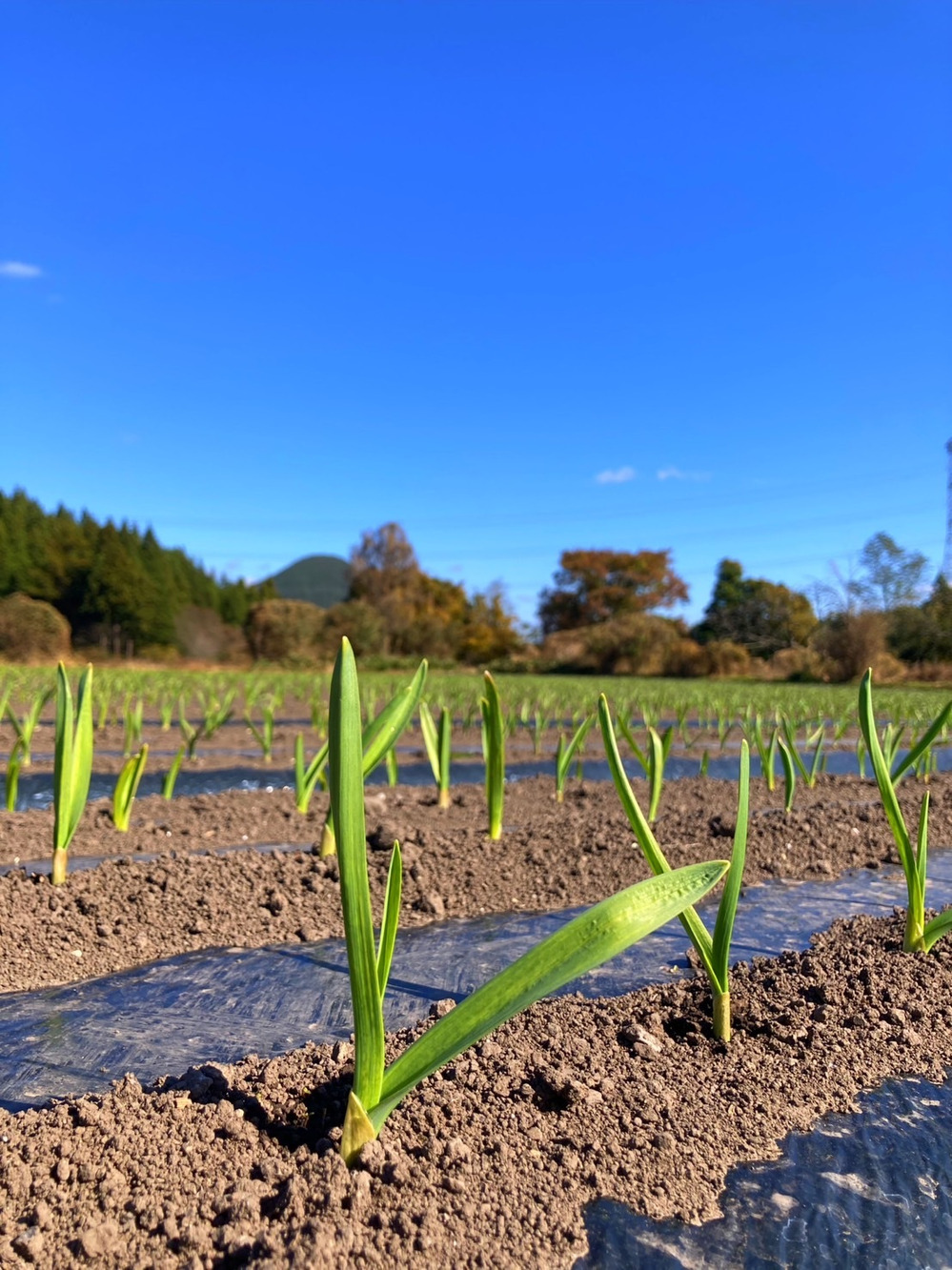 秋の空の青とにんにくの葉の緑のコントラストの美しいこと✨