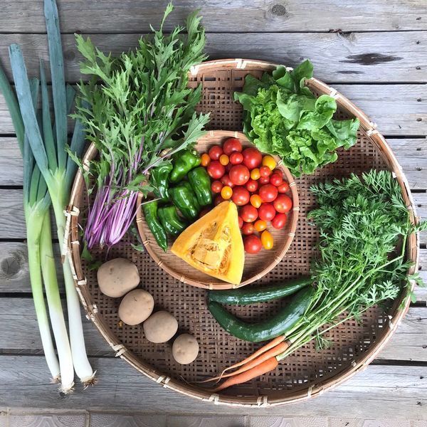 きゅうり、ピーマン、じゃがいも(アルバン)、間引き人参、サラダ菜、カボチャ、長ねぎ、トマトミニ&中玉ミックス、赤水菜