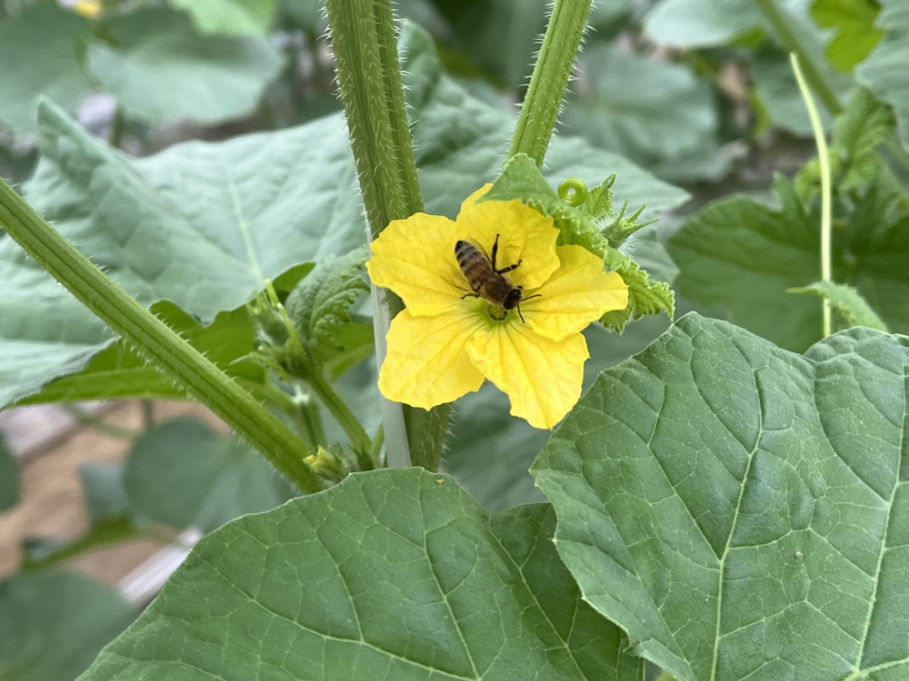 同じような黄色い花ですが側枝の葉の付け根の丸い玉の先に咲いているのが雌花、主枝の葉の付け根に咲いているのが雄花です。