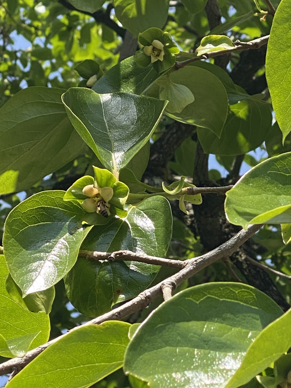 甲州百目柿のお花(二枚目の写真)は、大きいもので500gにもなるとは思えない、可憐で小さな白いお花。香は強くないのですが、蜂🐝にはわかる様です。