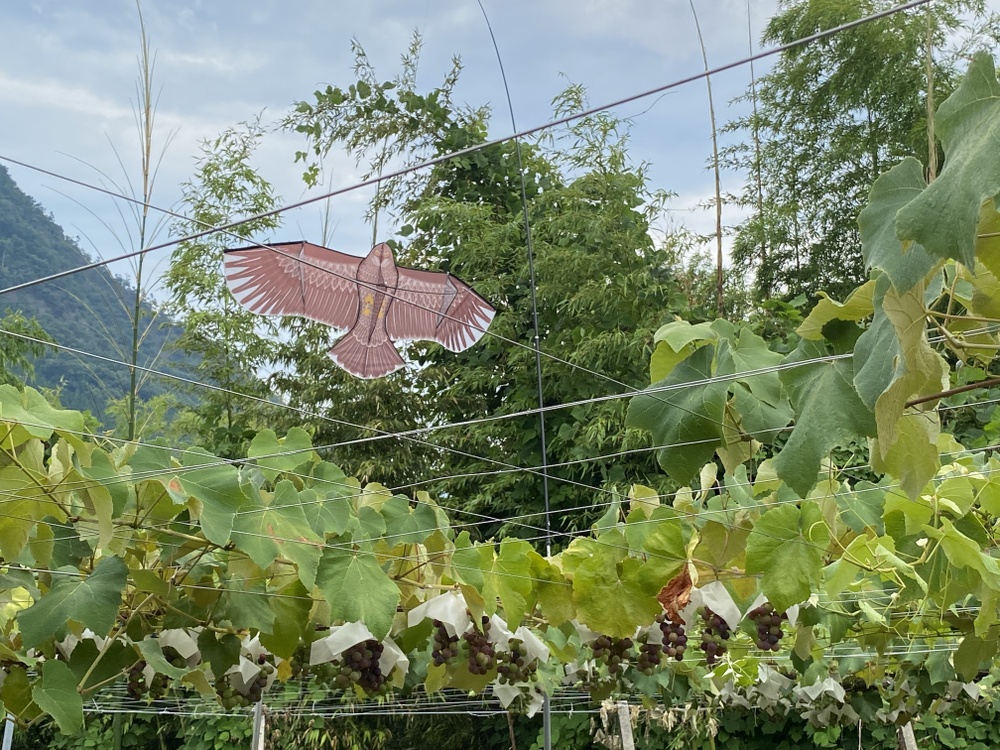 番犬ならぬ番鳥…強面のワシを設置!完全な防除にはなりませんが、大事なぶどうを少しでも横取りされない様に。(写真③)