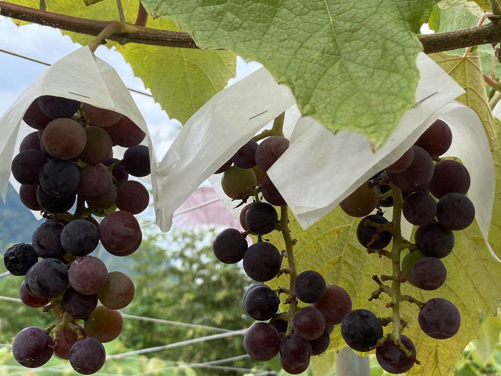 今のアジロンは、”ヴェレゾン”という色付きが始まった着色期に入っています。青く硬かった粒に、色が入り柔らかくジューシーになってきました。(写真①)