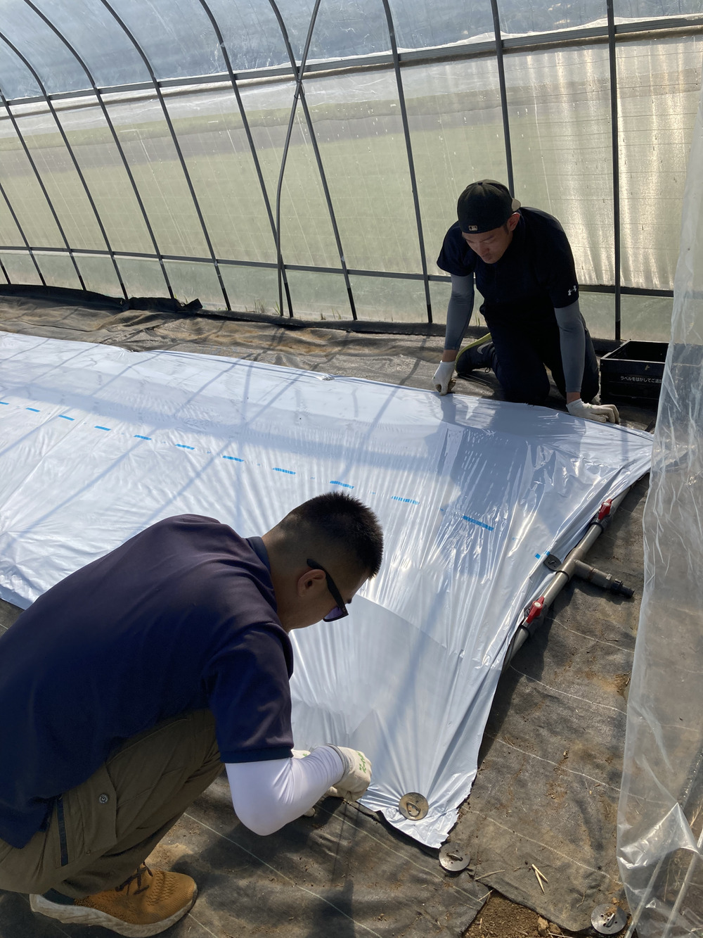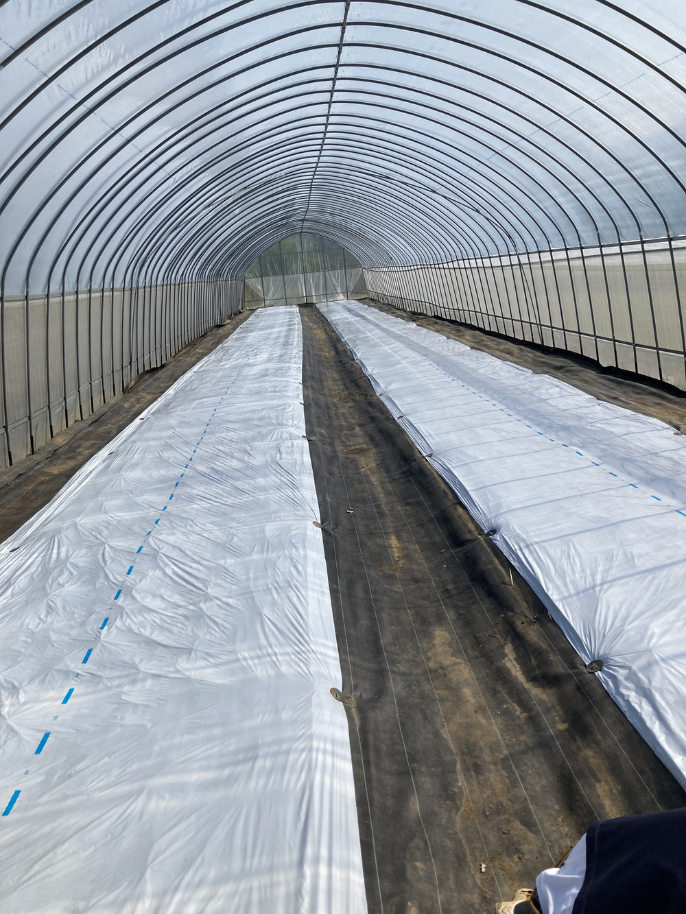 教えながらの農業なのでゆっくりではありますが、草刈り、土づくり、畝作り、マルチ 房総シート張りを終え、ビニール張り‼︎