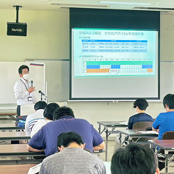 講義では現在クラカアグリが取り組んでいる水田を活用した野菜の生産、スマート農業や農業のIT活用などについて説明しました。