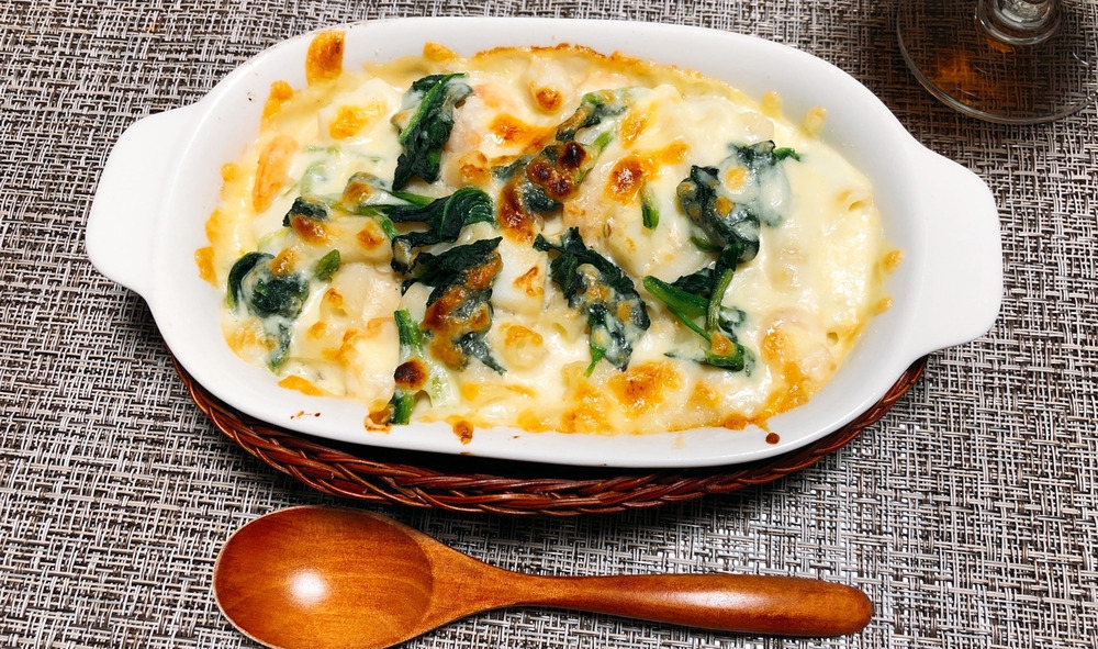 ⑧耐熱容器に入れ、上に野菜を散らし、とろけるチーズを散らしてオーブンか魚焼きグリルで焼き色を付けて出来上がり