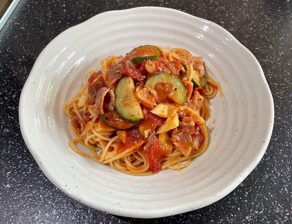 7月以降に販売予定の、弊社🍅トマトと天然塩🧂だけで作ったトマトソースの試作品で、ランチの🍝パスタを作りました。