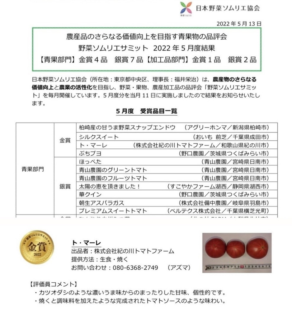 5月の野菜ソムリエサミットにて、弊社のトマト🍅「ト・マーレ」が金賞受賞🥇致しました!