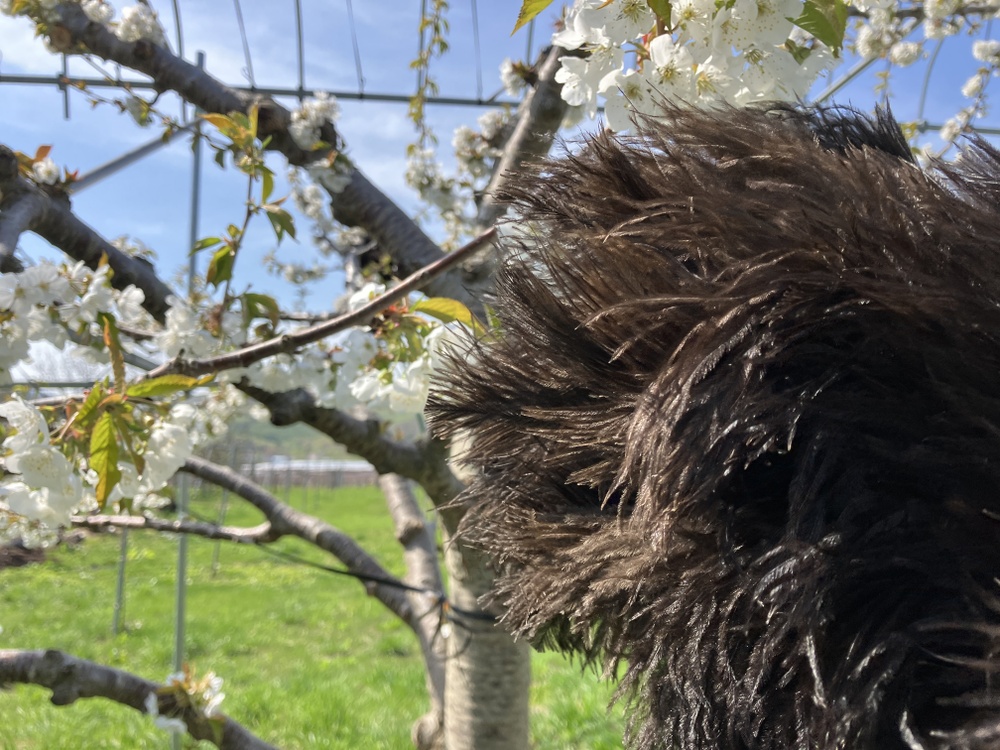 さくらんぼは別の品種の花粉を受粉しないと結実しないので、佐藤錦と紅秀峰を行ったり来たりで花粉をつけていきました。