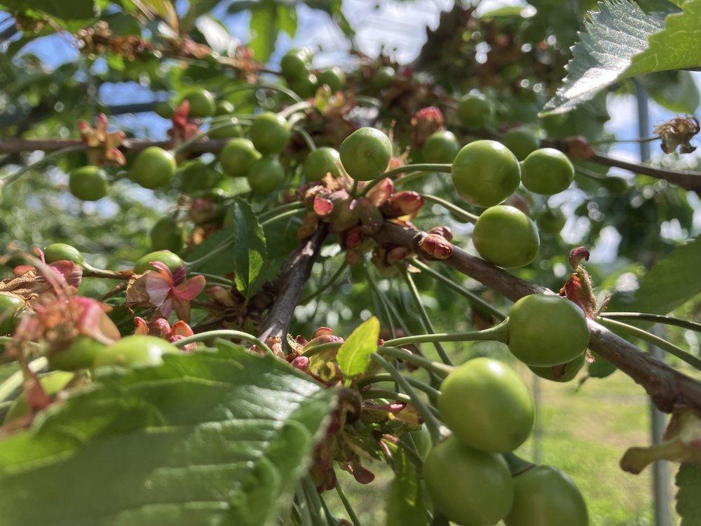 最近はブドウの手入れが続いていたのですが、ふと見ると、ここ数日でさくらんぼがずいぶん成長していました。