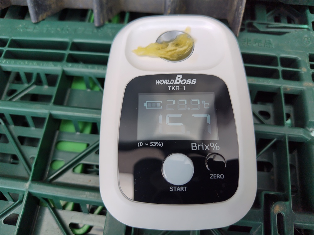 一昨日の大雨で裂果したと思われるくるめメロンの糖度を計測したところ「15.7度」有りましたので、本日収穫を開始しました🍈