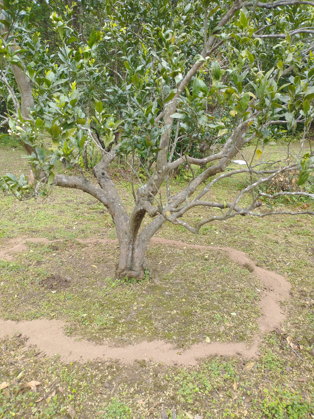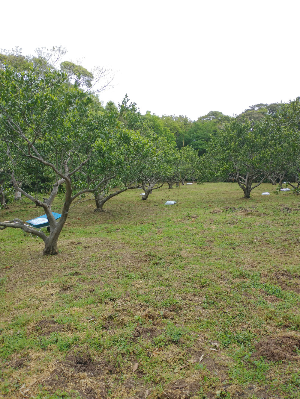 タンカン園のタンカンの樹下に醗酵鶏糞を撒きました。