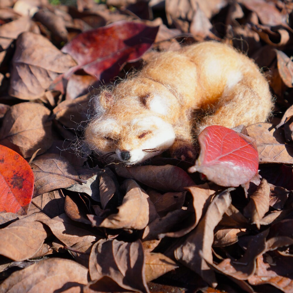 キツネさんが眠るのはブルーベリーの落ち葉🍂です。
