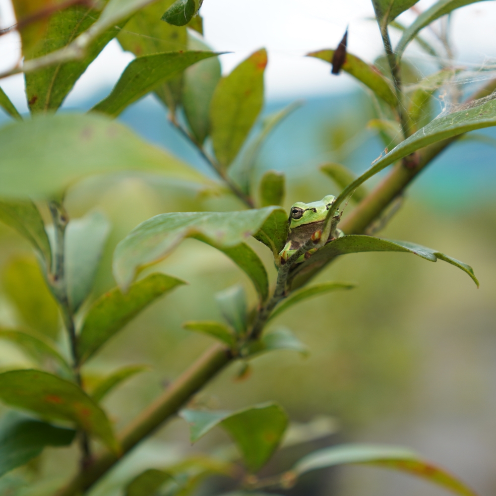 ブルーベリーの葉っぱに擬態中のカエル🐸さんです。
