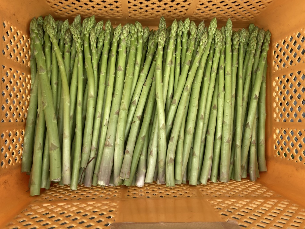 夏芽は、春芽収穫後親株を育て、葉(擬葉)で光合成させて、地下の根に栄養を回し、アスパラを生育させ収穫します。食感はシャキシャキとしたさわやかな甘みとうま味が特徴です。春芽より甘味と色は若干劣りますが朝採りのアスパラを皆さんの食卓にいかがですか。
