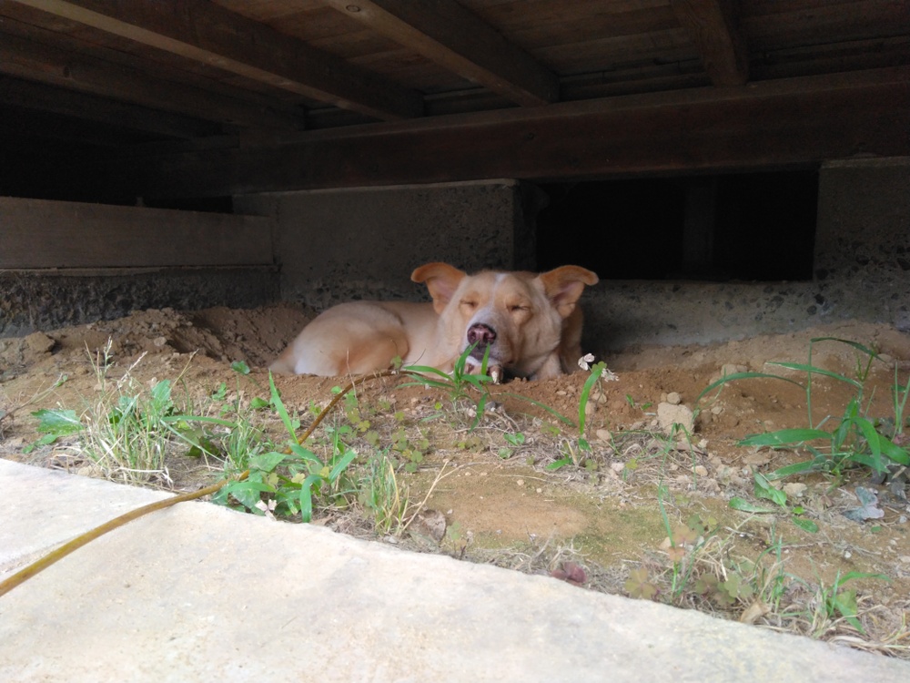 お天気がどんよりしていたせいなのか、縁側の下に自分で掘ったくぼみにハマって瞑想してました。