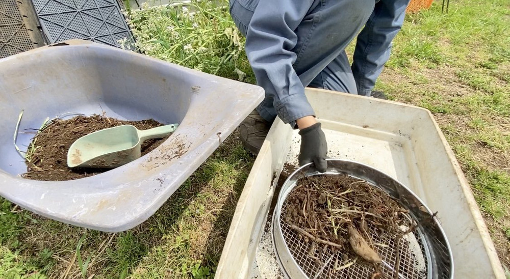 苗を育てる土も、圃場で育ったお野菜を片付けたガラや刈った草を数年積み上げて土にしたもので、圃場外からの持ち込みを一切していません(米糠や落ち葉なども一切入れません)。