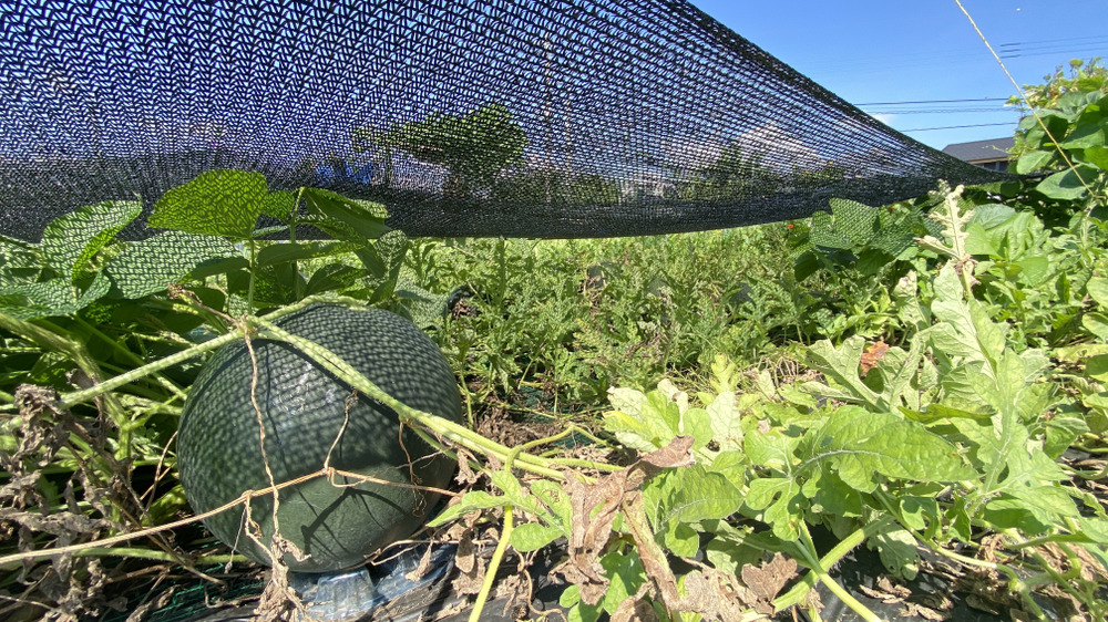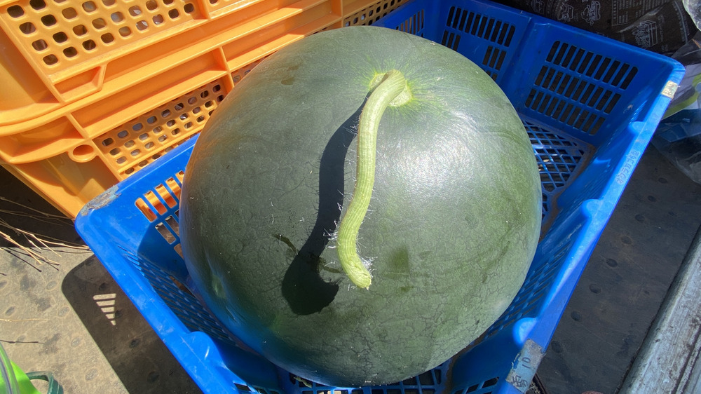 当農場のスイカは高級メロンの育て方と一緒で、1本の蔓から1個のスイカしか実らせません。