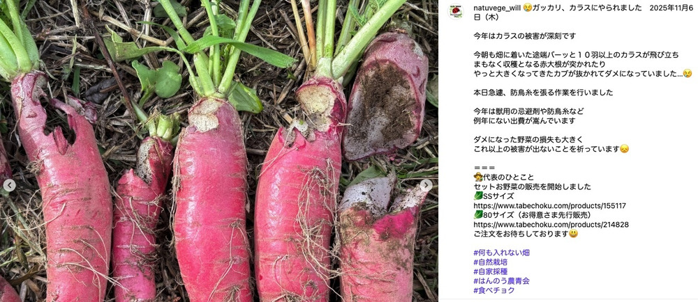 鳥獣被害に遭った生産者さんの農林水産物を「食べて応援」ページ(https://www.tabechoku.com/feature_articles/wildlife-damage-support-202511 )に、当農場のお野菜セット(80サイズ)を載せていただきました。