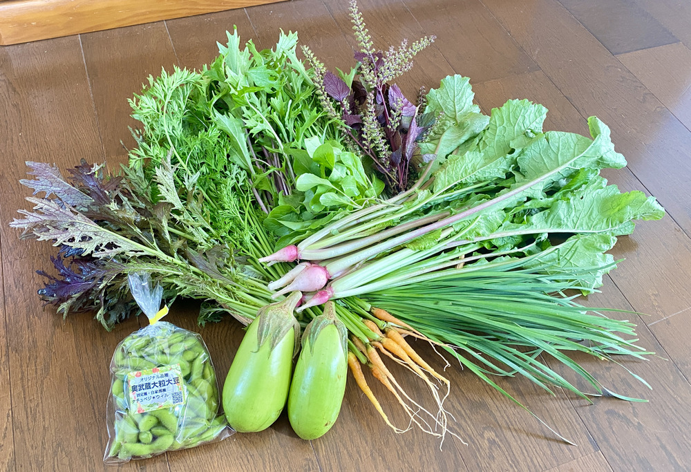 真黒なす・長なす・緑なす・紫蘇の実(青・赤)・ニラ・赤からし菜・小松菜・水菜(緑・赤)・間引き菜(人参・カブなど)・ベビーリーフ(ルッコラ他、葉物野菜)・雪化粧かぼちゃ・鶴首かぼちゃ・姫冬瓜